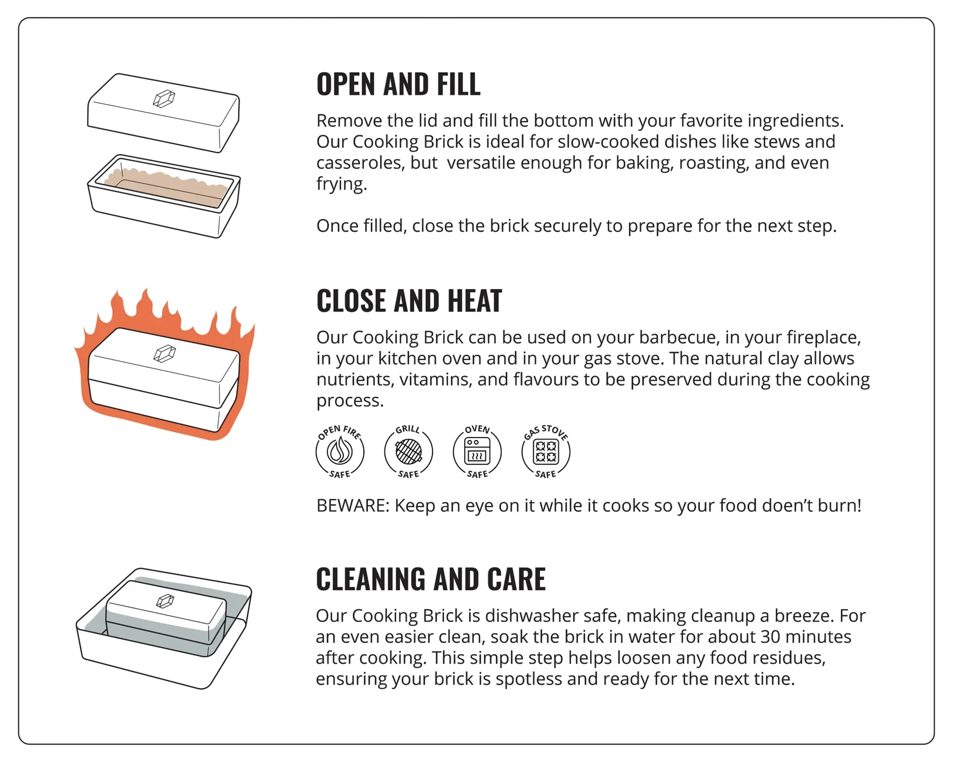 Een veelzijdig, gemakkelijk te gebruiken kookgereedschap (voor de barbecue). Hak simpelweg je favoriete ingrediënten, stop ze in de Brick en plaats deze op elke warmtebron. Een heerlijk gerecht is binnen 30 minuten klaar. Gemaakt van natuurlijke, hittebestendige klei, waardoor het ook voedzaam is, omdat het de voedingsstoffen, vitamines en pure smaak vasthoudt.