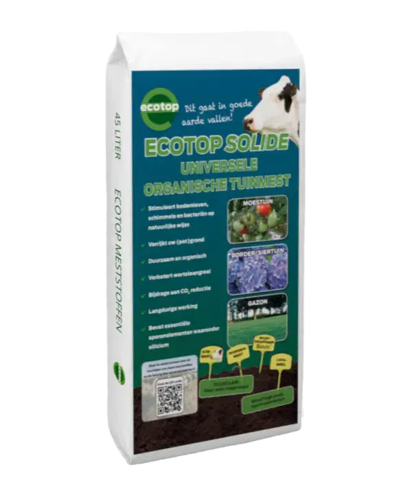 Ecotop Solide is een mengsel dat bestaat uit gecomposteerde (onkruid vrije) koemest, wormenmest, steenmeel, schimmels en bacteriën (waaronder de bacillus). Deze geurarme organische meststof zorgt voor de perfecte aangroei van uw planten en stimuleert het bodemleven op natuurlijke wijze. Door de toevoegingen heeft u de meest hoogwaardige duurzame meststof voor uw tuin.