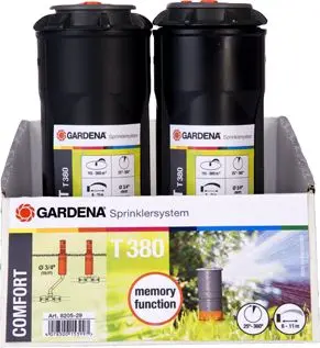 De Gardena Verzonken turbinesproeier T 380 - als onderdeel van het Gardena Sprinklersystem - is zeer geschikt voor het besproeien van middelgrote gazons tot 380 m². Waar nodig kan de Verzonken turbinesproeier T 380 worden gecombineerd met de Verzonken turbinesproeiers T 100 en 200 (art. nr. 8201-29 en 8203-29) en de Verzonken zwenksproeier OS 140 (art. nr. 8220). Het bereik is variabel tussen 6 en 11 m voor het afzonderlijke oppervlak instelbaar. De sector die moet worden besproeid kan traploos (zonder gereedschap) op de sproeierkop worden aangepast van 25 tot 360°. Hiermee kunt u kleine sectoren of in een volledige cirkel besproeien. Door de geheugenfunctie gaat de sproeier automatisch terug naar de ingestelde sector, ook als de sproeierkop handmatig is gedraaid. Zo wordt altijd het juiste gebied besproeid. Voor flexibele besproeiing zijn er vier spuitmonden met verschillende toevoersnelheden, die kunnen worden geselecteerd op basis van het te besproeien oppervlak. Dit is vooral belangrijk voor een gelijkmatige besproeiing bij gebruik van meerdere soorten sproeiers en verschillende ingestelde besproeiingsoppervlakken. Het geïntegreerde vuilfilter zorgt voor een ononderbroken werking. Het betrouwbare, zandbestendige turbinetandwiel zorgt voor een lange levensduur. Door de installatie van een Ontwateringsventiel (art. nr. 2760-20) in de leiding is het Sprinklersystem vorstbestendig. Voor aansluiting is er een binnendraad van 3/4" aanwezig.