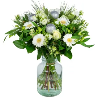 Kerstboeket met gemengde bloemen en kerstmaterialen.
