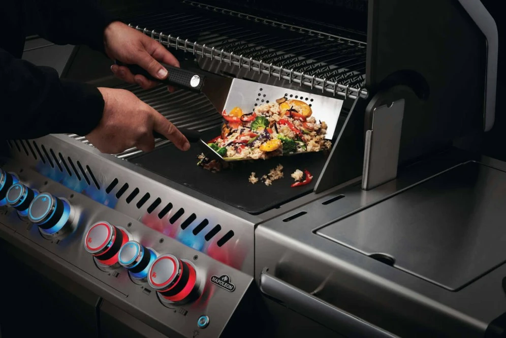 Probeer eens te grillen in Europese stijl met deze driedelige plancha-gereedschapset, ideaal voor gebruik met de gietijzeren plancha en grillplaat van Napoleon. De extra grote spatels zijn geschikt voor allerlei soorten voedsel. De solide en flexibele spatel is perfect voor rijst, groenten en zeevruchten, terwijl de geperforeerde spatel ideaal is voor hamburgers en vis. Gebruik de hakker/schraper voor het gemakkelijk hakken van etenswaren en snel schoonmaken van de grillplaat. De duurzame RVS constructie met ergonomische handgrepen betekent jarenlang comfortabel gebruik.