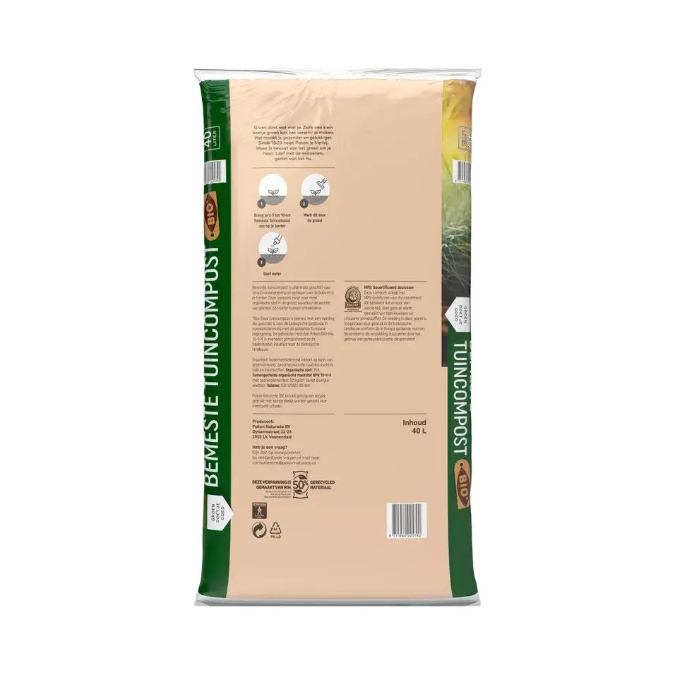 Pokon Bio Bemeste Tuincompost is een organisch bodemverbeterend middel op basis van groencompost, gecomposteerde naaldhoutschors, kalk en meststoffen. Deze potgrond is bemest met een samengestelde organische meststof NPK 10-4-4. Deze meststof is geschikt voor de biologische landbouw in overeenstemming met de geldende Europese regelgeving en eveneens geregistreerd op de Nederlandse inputlijst voor de biologische landbouw.