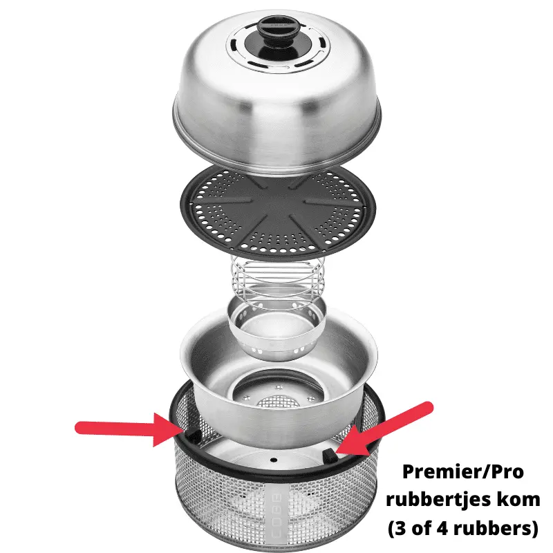 Deze rubbertjes horen in de kunststof ring van de mantel van de COBB Premier (Air) en COBB Pro (Compact). Deze rubbertjes zorgen voor voldoende afstand tussen de (hete) binnenkom en de kunststof ring van de mantel. De rubbertjes voorkomen dat de kunststofring op de mantel gaat smelten.