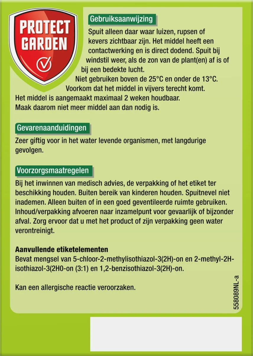 Protect Garden Desect® insecten concentraat is een insecten bestrijdingsmiddel tegen o.a. luizen, rupsen, kevers en de buxusmot. Het concentraat bestrijdt ongedierte op groenten en sierplanten. Meng het concentraat met water voor het maken van een insectenspray en spuit dit op de planten. Door de snelle werking zie je al snel resultaat.