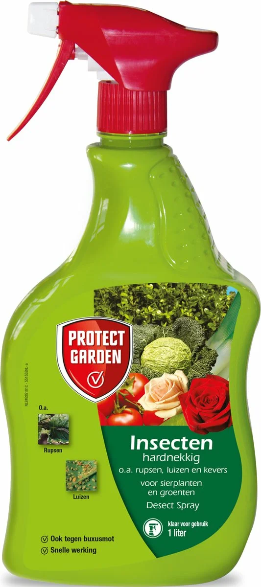 Protect Garden Desect® insectenspray is een insecten bestrijdingsmiddel tegen o.a. luizen, rupsen, kevers en de buxusmot. De insecten spray bestrijdt ongedierte op groenten en sierplanten. Spuit de spray op de planten en je zult al snel effectief resultaat zien.