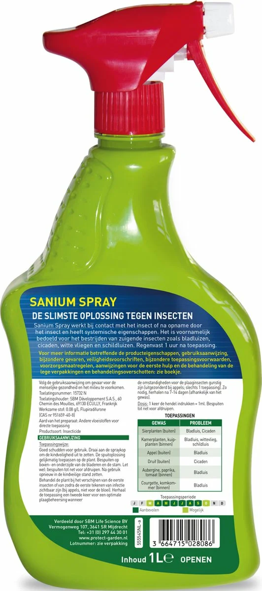 Protect Garden Sanium Insectenspray is een insecten bestrijdingsmiddel tegen o.a. bladluizen, schildluizen, witte vlieg en wolluizen. De insectenspray bestrijdt ongedierte op je sierplanten, fruit en groenten. De spray werkt al binnen 1 uur en kan tot wel 8 weken bescherming bieden